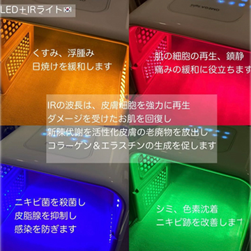 IRが付いて、光のスペックも皮膚科治療で使われているヒーライトとほぼ変わらず皮膚科よりも気軽にダウンタイムなく効果の実感出来る新しい次世代LED。